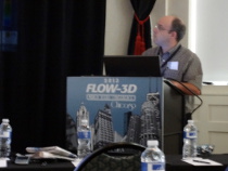 コーヒーブレイクを挟んでHydro-Quebec Equipement(カナダ)のBilodeau氏から水理分野におけるFLOW-3Dのバッフル機能の利用事例をご紹介いただきました。いくつか検証例を上げていただきましたが、板状の障害物を簡単に扱え、精度も悪くないと高評価でした。